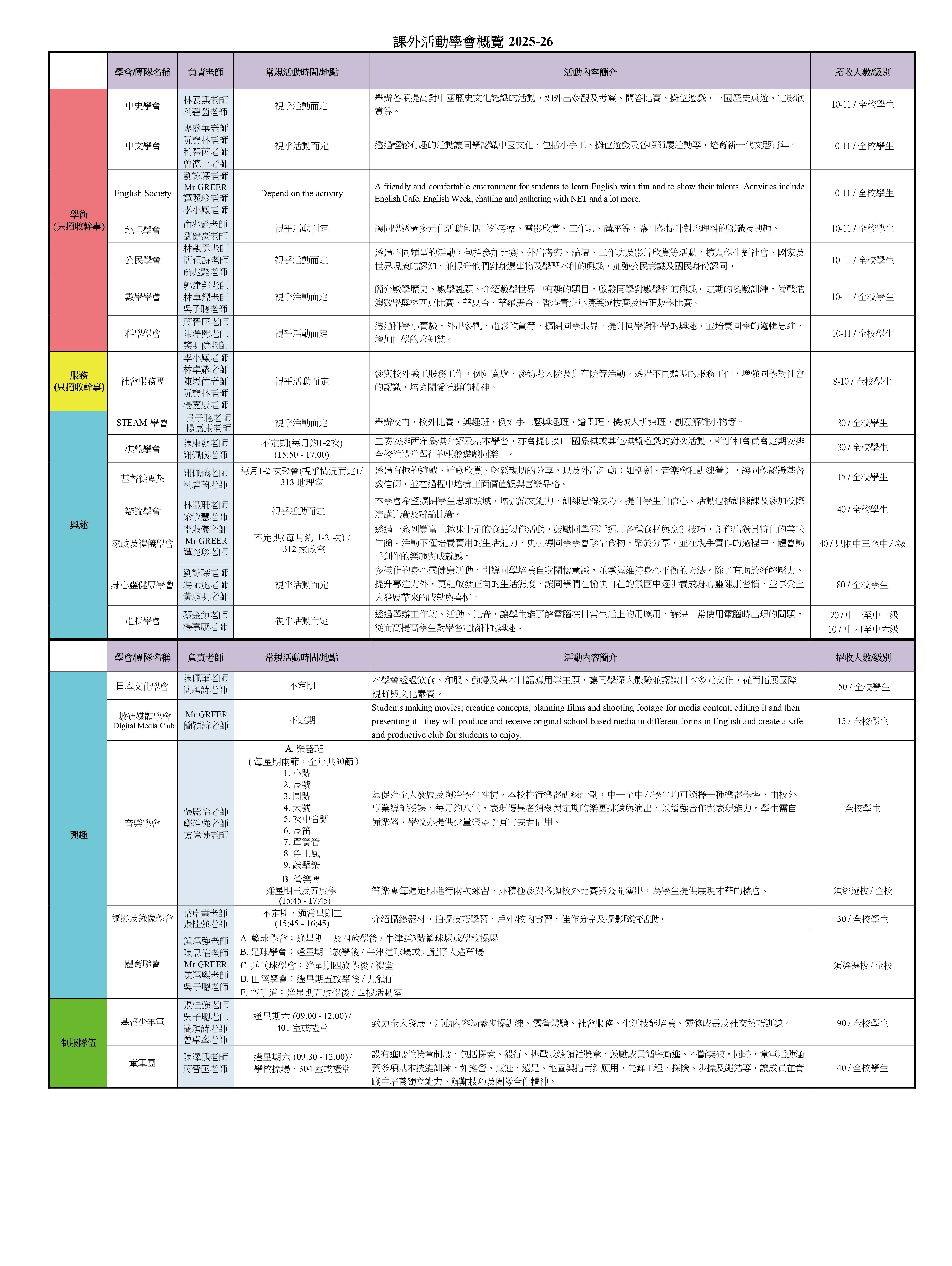 課外活動一覽表